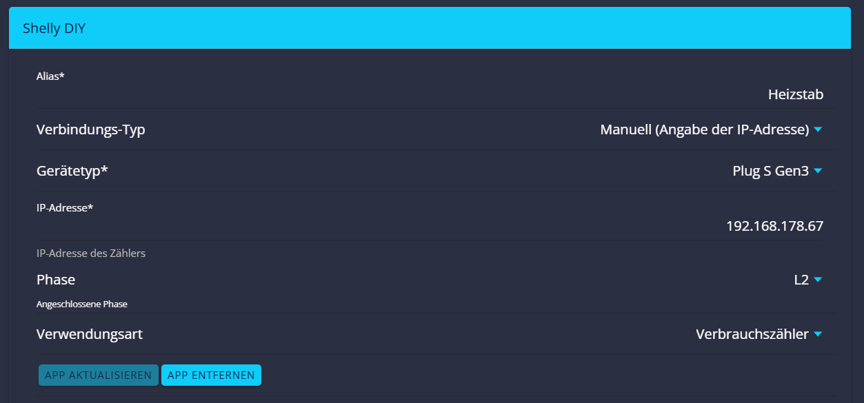 2. Aktuell mache ich es mir einfach und nutze nur einen Emulator mit der Shelly DIY App. Die gesamte Leitung wird dann auf einer Phase (bei mir L3) gemeldet. Das scheint problemlos zu sein. Nur wenn man in der Historie im Untermenü Verbrauch auf „phasengenau“ klickt, dann stimmt es nicht. Für die Gesamtstatistik ist das bisher ohne Belang.