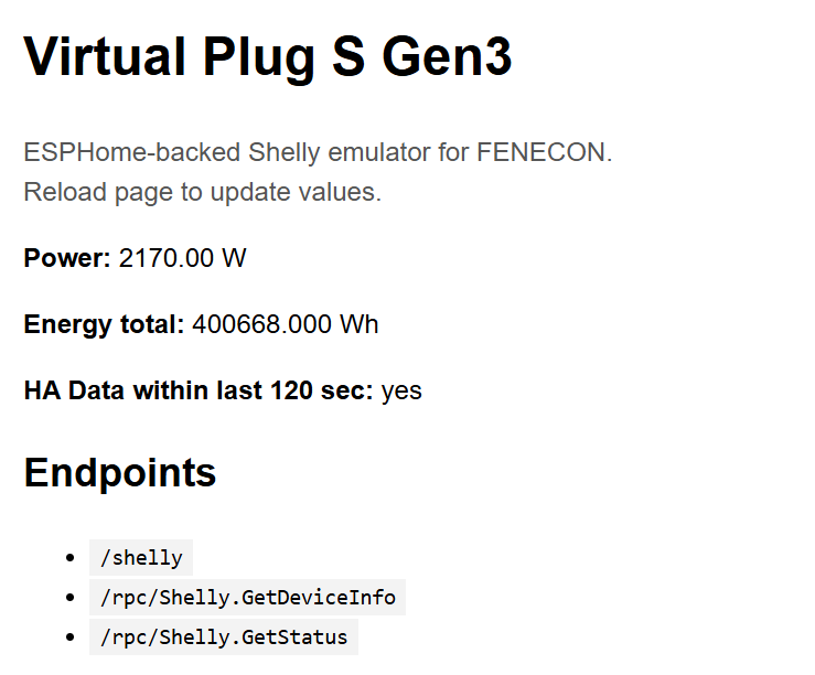 Ich hatte das Problem, dass ich einem Fenecon Home System lokale Leistungs- und Energiewerte meiner Wallbox und eines Heizstabes zur Verfügung stellen wollte. Man kann natürlich separate Energiezähler kaufen und bei Fenecon App Lizenzen für eben diese Energiezähler. Das kostet am Ende erklecklich viel Geld. Es gibt aber auch die kostenlose Shelly DIY App. Damit erlaubt Fenecon das lokale einbinden einfacher Shelly Wifi Stecker. Allerdings ist meine Wallbox kein Shelly Gerät und 3-phasig. Und der Heizstab läuft mit Tasmota. Also lag die Idee nahe, genau die offen dokumentierte Shelly API zu emulieren, so dass die Fenecon Shelly DIY App die Geräte erkennt.